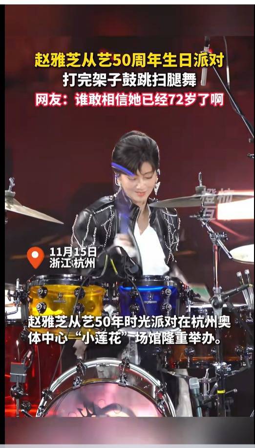 11月17日,据津云新闻消息,11月15日,赵雅芝从艺50年时光派对在杭州奥体中心“小莲花”场馆隆重举办。派对开场赵雅芝以架子鼓演奏《潇洒走一回》颠覆优雅形象,展现飒爽魅力,被赞“七旬老太玩转摇滚”,“扫腿舞”环节因NG重跳引爆笑点。