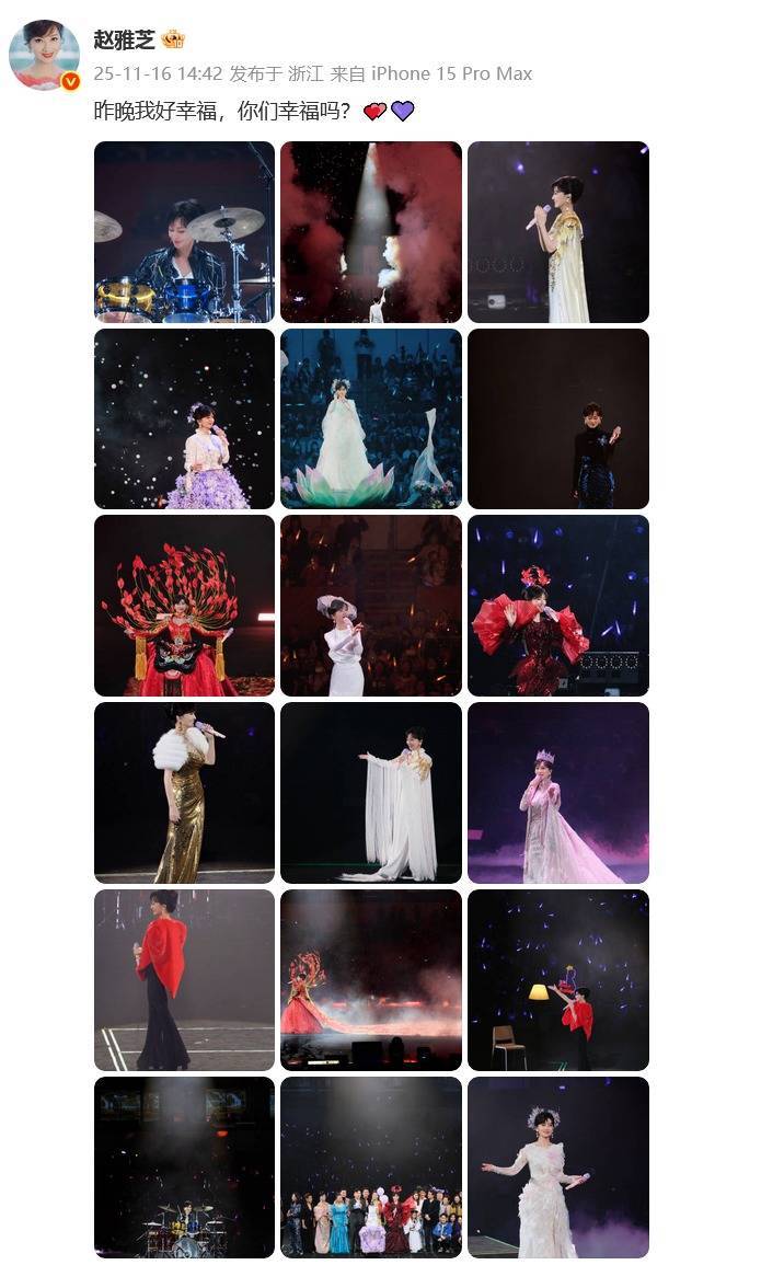 16日,赵雅芝晒出多张现场图回应:昨晚我好幸福,你们幸福吗?