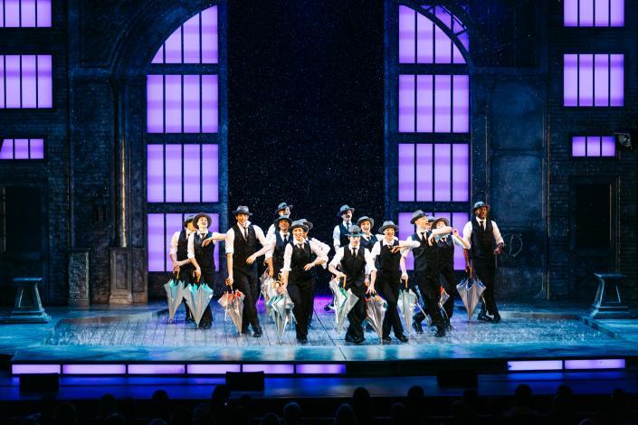 当男主角唐·洛克伍德在《雨中曲》旋律中跃入雨中,水花随着踢踏舞步四溅,灯光映照出雨丝的晶莹,这一场景不仅复刻了演员吉恩·凯利在电影中“雨中独舞”的永恒经典,更以剧场独有的真实感,让观众仿佛置身于那一场酣畅淋漓的雨中欢唱之中。