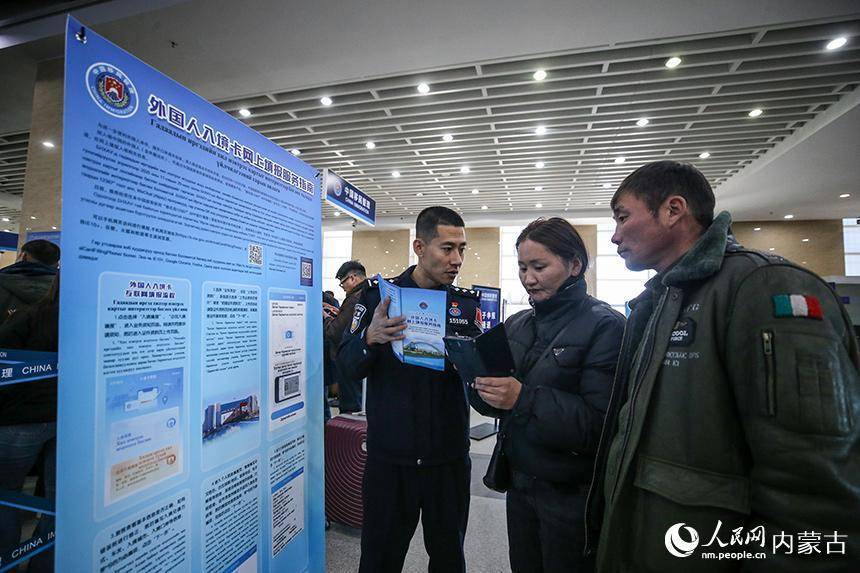 二连出入境边防检查站移民管理警察为旅客讲解外国人入境卡网上填报流程。郭鹏杰摄