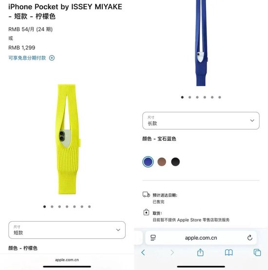 11月14日,苹果与三宅一生(ISSEY MIYAKE)联合推出的全新配件iPhone Pocket正式开售,短带款售价1299元、长带款售价1899元。中国大陆境内,该配件仅在上海Apple静安零售店和苹果官网有售。