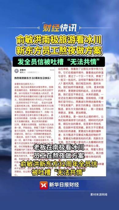 日前,新东方迎来成立32周年纪念日,身处南极的俞敏洪给员工发内部信,信中5次提及南极。不少员工看到后对此吐槽“你在南极看企鹅,我在工位当牛马”。